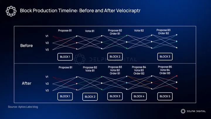 The efficiency gains become evident when comparing block production timelines. Under the previous two-network-delay system, the network would produce three blocks within a given timeframe. Velociraptr, however, produces five blocks by proposing every network hop rather than every two rounds.