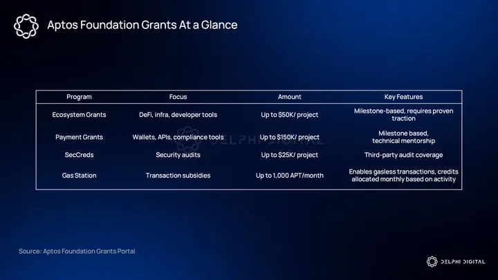 In July 2025, Aptos Foundation announced the Aptos Payments Grant track, offering milestone-based funding up to $150,000 for teams building payment infrastructure, including wallets, APIs, compliance tools, and related services. Grantees also receive Gas Station credits for abstracting gas for user transactions, security audit support, technical mentorship, and marketing amplification through various channels. The track targets teams addressing both traditional payment infrastructure gaps and crypto-native use cases- from replacing legacy systems and enabling stablecoin commerce to building novel applications like streaming payments and agent-to-agent transactions.