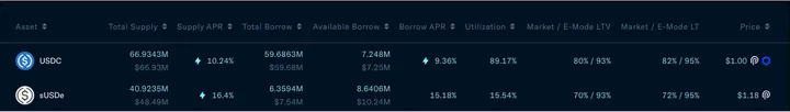 A more sophisticated recursive strategy involves Ethena’s sUSDe, which offers unique yield stacking opportunities due to its underlying structure. On Echelon, sUSDe suppliers earn an APR of 16.4% while borrowing USDC costs 9.36%, creating a positive spread of approximately 7.04%.