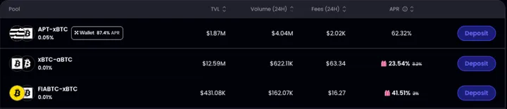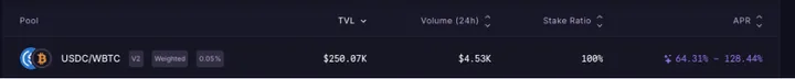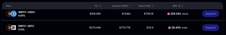 Newly launched WBTC pools have also further expanded Bitcoin yield opportunities. The WBTC-USDC pool, for example, yields an APR of 229.32% with $518,450 in TVL, while the WBTC-xBTC pool offers an APR of 26.43% with $274,440 in TVL, providing both Bitcoin-stablecoin and Bitcoin-Bitcoin derivative exposure options.