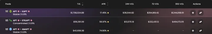 Among Tapp’s APT-LST offerings, several pools stand out for their yield potential. The APT-kAPT stable pool offers an APR of 17.45% with $1.7 million in TVL, pairing native APT with Kofi’s liquid staking derivative. For users seeking higher yields, the APT-stKAPT concentrated liquidity pool delivers an APR of 56.97% with $56,391 in TVL, though the lower TVL suggests this pool requires more active management.