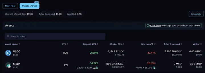 The mechanics involve depositing MKLP tokens to earn Merkle’s base APR of 54.22% while using them as collateral at 15% LTV on Aries. Users can then borrow USDC at an APR of 42.47% against their MKLP collateral and convert the borrowed USDC back to additional MKLP tokens, creating a recursive loop.