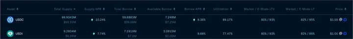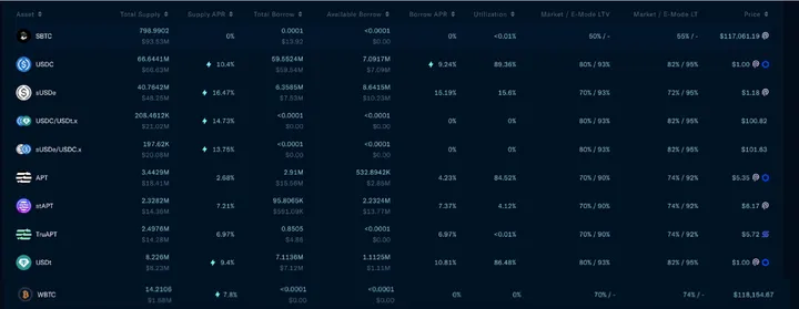 For example, users can supply USDC on Echelon to earn an APR of ~10.24% while borrowing at 9.36%, or supply USDT, earning 7.74% while borrowing at 9.68%.Note that USDC creates a positive spread (earning more than you pay), while USDT creates a negative spread (paying more than you earn).