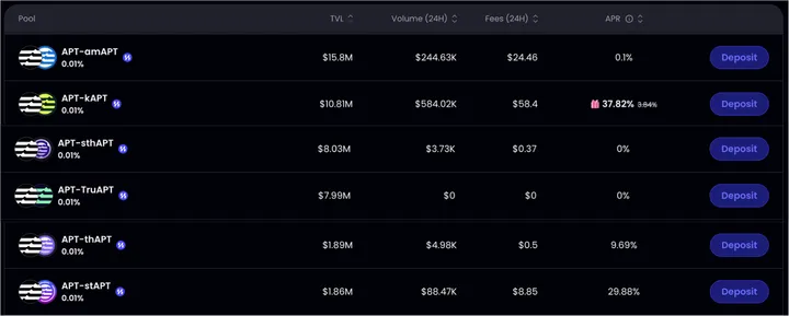 The APT-amAPT stable pool provides an APR of 74.90% with $43,938 in TVL, pairing APT with Amnis Finance’s liquid derivative.