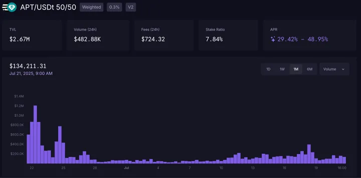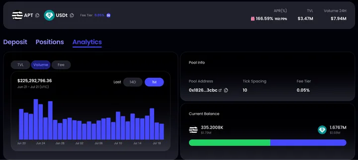 The APT-USDT pool tells a similar story. It delivers an APR of 166.59%, with 162.79% stemming from trading fees and 3.8% from farming rewards. This pool processed $225 million in volume against a TVL of just $3.47 million over the same one-month period.