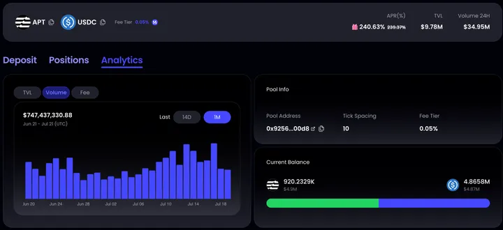 The protocol’s flagship APT-USDC pool exemplifies Hyperion’s yield potential, currently delivering a total APR of 240.63%, though yields vary with market dynamics and liquidity conditions.