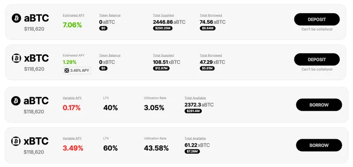 Echo Protocol leads Bitcoin lending on Aptos with significant liquidity: aBTC offers an APY of 7.06% with $290.25 million in total supplied, while xBTC provides an APY of 1.29% (plus a 3.49% boost) with $12.87 million supplied.