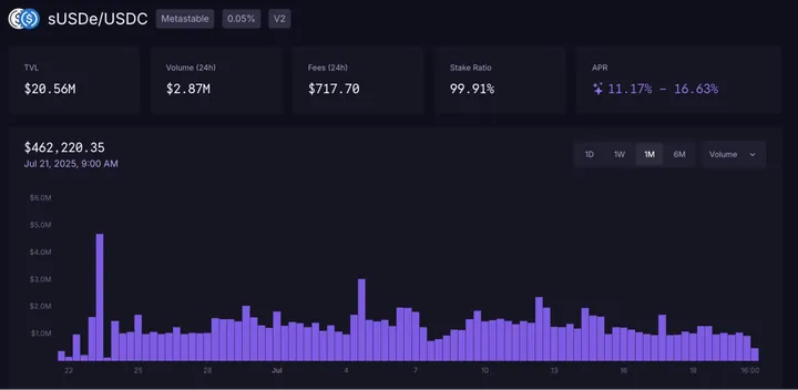 Thala’s sUSDe-USDC metastable pool offers an APR of 11.17% – 16.63% through a more complex structure: 1.27% swap fees, 4.44% from Ethena staking, and 5.44% thAPT staking rewards. This pool maintains $20.56 million in TVL with a lower daily volume of roughly $3 million, generating $718 in daily fees.