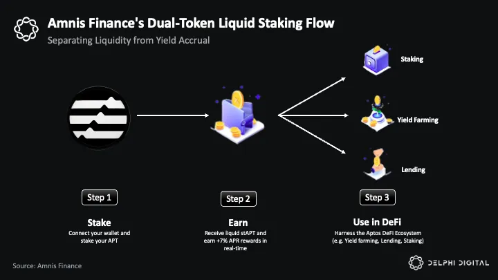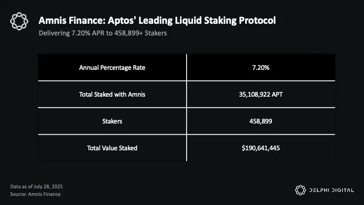 Amnis Finance operates with $183 million in TVL through a dual-token system that separates liquidity from yield accrual. Users can mint amAPT using their APT at a 1:1 ratio, then stake amAPT for stAPT to earn an APR of approximately 7.2%.