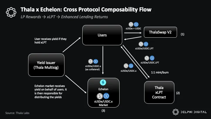 Users can supply xLPT tokens (generated from staking Thala’s USDC-USDT and sUSDe-USDC LP positions) directly on Echelon to earn additional yield.