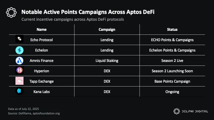 Beyond the established protocols generating yields and running incentive campaigns, Aptos is home to several notable projects that have yet to launch native tokens. Some of these protocols are actively running the points campaigns outlined in the previous section. These protocols span various DeFi categories and represent different stages of development and adoption.