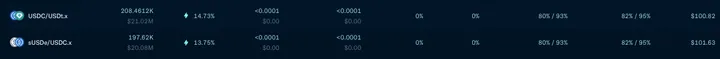 The USDC/USDT.x and sUSDe/USDC.x markets show APRs of 14.73% and 13.75%, respectively. This allows users to earn lending yields on top of their existing DEX LP returns.