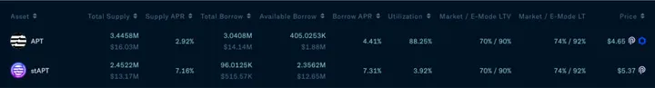 A more conservative recursive approach involves liquid staking derivatives, which offer leveraged APT exposure with reduced complexity. Users can supply stAPT on Echelon earning an APR of 7.16% while borrowing APT against it at 4.41%, creating a positive spread of 275 basis points.