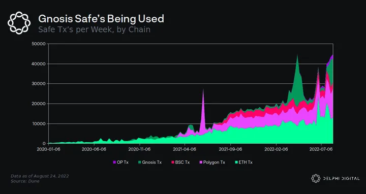 - These numbers speak to its broad adoption and hammer home the pervasiveness of Gnosis Safes. For comparison, DAOhaus, a DAO platform that allows for multi-party asset custody, has 2.6k DAOs using its platform.