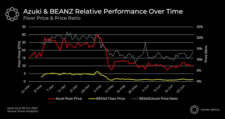 - Ratio of BEANZ price to Azuki price: 11.4% (or 22.8% for 2 BEANZ)