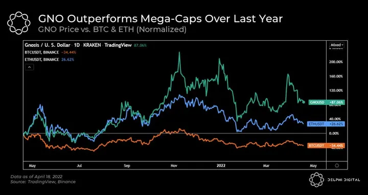 - Our Position: Taken with other favorable GNO tailwinds, like SAFE token allocations and an increase in Gnosis Chain TVL, this could potentially lead to a surge in the price of GNO. So for that fact alone, investors should watch how this plays out to position themselves accordingly. Notably, GNO has had a strong run outperforming BTC and ETH by ~120 and ~60 percentage points over the last year, respectively.