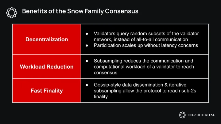These bottlenecks are exactly what Avalanche aimed to solve with their Snow Family of consensus protocols: Slush, Snowflake, and Snowball. The main idea is that validators can reach consensus without directly communicating with everybody – via subsampling.