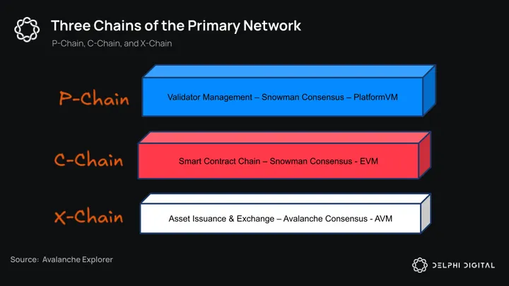 The Primary Network consists of three permissionless chains. The P-Chain for validator management, the C-Chain for smart contract deployment (EVM), and the X-Chain for payment and native asset transfer.