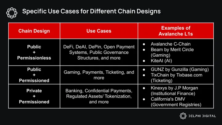 Developers had meaningful control over the design of their L1s. They could customize execution logic, make applications permissioned or permissionless, and choose whether their chain was private or public. That flexibility allowed them to tailor Avalanche L1s for specific use cases and business needs (e.g. financial institutions that require privacy rails to conform with regulations).