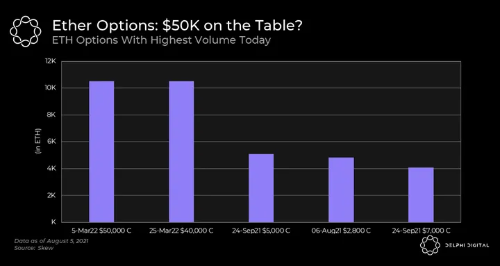 - The vast majority of ETH option activity came from call buying, implying bullishness. But this bullish sentiment isn’t short-term. Today’s most popular options were ETH calls with strike prices of $50,000 and $40,000 that expire in March 2022. Talk about high-time preference!