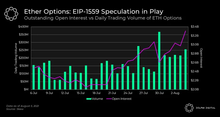 - There’s been a notable increase in open interest and volume on ETH options. With the much-anticipated EIP-1559 going live in today’s London hard fork, the most obvious theory is that traders have been using derivatives, such as options, to speculate on the outcome.