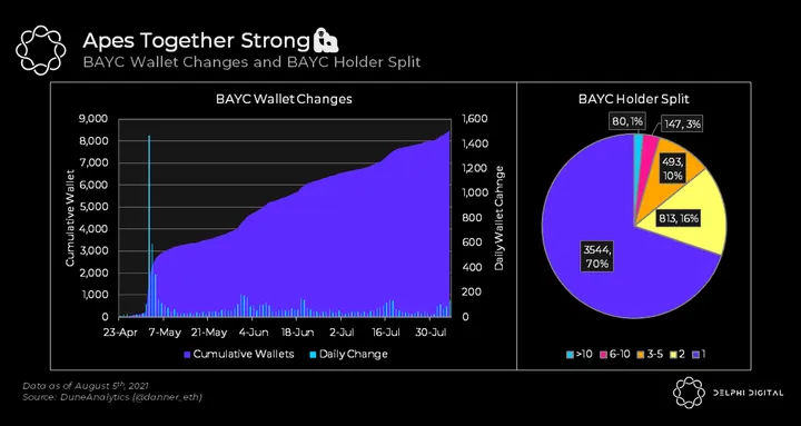 - The BAYC distribution is relatively widespread with ~70% of holders owning 1 compared to just 80 holders (~1%) holding more than 10. With 5,000+ unique owners and counting, BAYC has proven itself to be the most decentralized (in terms of BAYC concentration) and vibrant Discord community the profile picture (PFP) NFT space has to offer.
