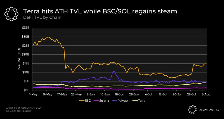 - As the Ethereum community celebrates EIP-1559 and NFT seasons, the Terra & Solana ecosystems are flourishing behind the scenes with their DeFi TVL breaching & approaching all-time highs respectively.