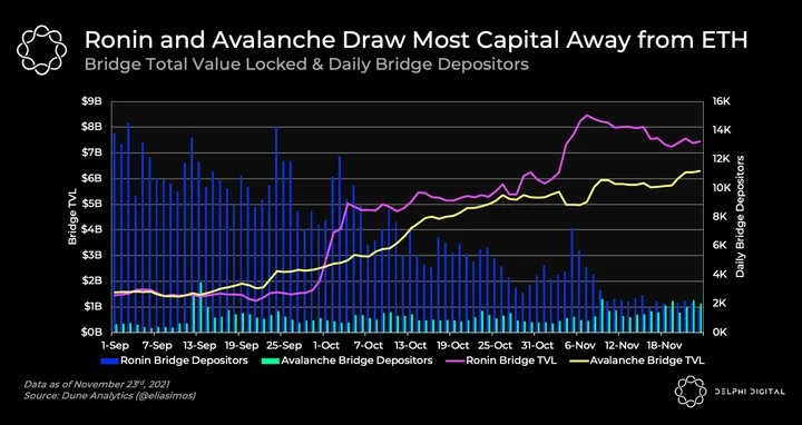 - As scaling solutions come, we see high bridging activity as funds move away from the expensive Ethereum chain and continue staying there. Of all the chains, Ronin and Avalanche have seen the highest activity and funds moved.