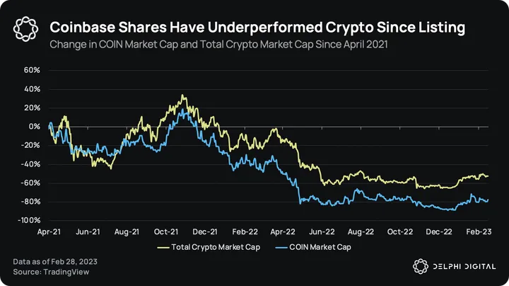 There is no plan for a BASE token. Coinbase doesn’t need a token to incentivize usage of its chain as it already has a colossal user base. ETH will be the native gas token of the chain, with plans for account abstraction enabling users to pay fees with whatever coin they want. However, there are COIN shares listed on Nasdaq. Since the company’s listing in April 2021, the stock has closely tracked and under-performed the total crypto market capitalization. However, the stock is up 82% since the beginning of 2023 while total crypto is up only 36%. Currently, the exchange trades at 3x the cash and cash equivalents reported in its latest quarterly filing.