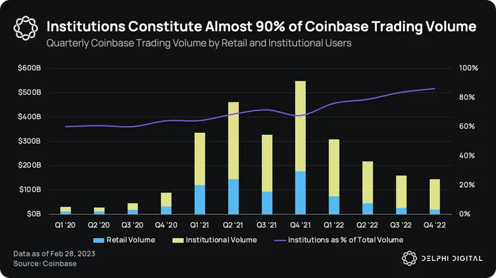 On the exchange side, the company’s business model depends on charging transaction fees to retail users. In its latest quarterly filing, retail users accounted for only 14% of the trading volume yet brought in 96% of the transaction revenue. This is a secular trend where institutions have been contributing a larger and larger share of the trading volume, rising to 86% from 68% in the same quarter last year.
