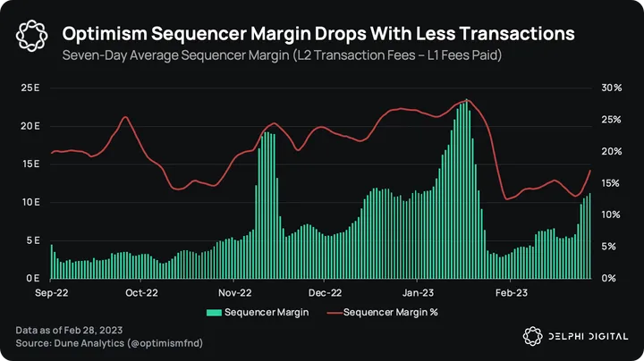 Optimism runs a sequencer, which does all the dirty work of rolling up transactions and posting them to Ethereum. The sequencer earns fees from L2 transactions and pays gas fees to settle them on the L1. The margin is the difference between the two. Alongside transactions, the sequencer margin is also down from a peak of 28% on Jan. 18, 2023, to the current 17%.