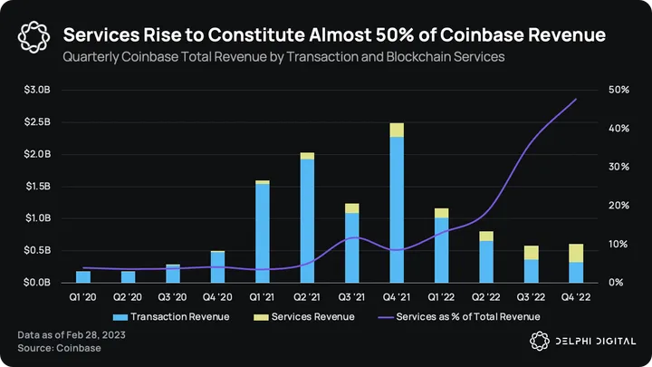 Although the company is largely recognized for the exchange platform, it also provides ancillary services such as delegated staking, the USDC stablecoin, payment service, debit card, and subscription services. In its latest quarterly filing, these ancillary services constituted 47% of the total revenue, up from 9% in the same quarter last year. In large part, this is a result of cratering trading fees from the exchange side in the face of a brutal crypto bear market. As interest rates increase, the risk-free yield earned on USDC balances has become a rather important component of the services revenue.