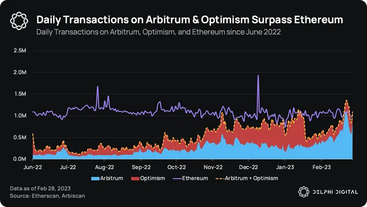 Combined daily transactions on Arbitrum and Optimism have surpassed Ethereum on five of the previous seven days. Daily transactions on Optimism have increased by 21% since the start of 2023, despite dropping by -60% on Jan. 18, 2023, when the Optimism Quests program ended.