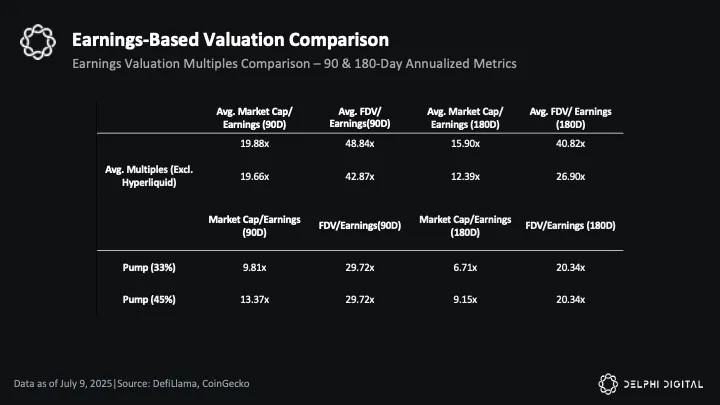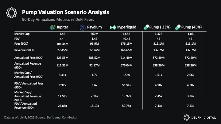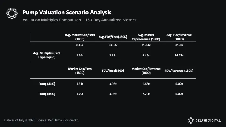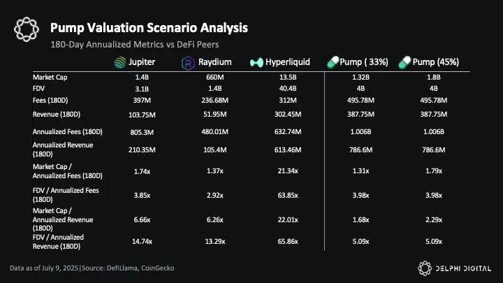 Compared to average multiples, Pump’s 5.09x FDV/revenue would be 64% cheaper than the peer average (excluding Hyperliquid) of 14.02x. If priced like peers, Pump’s FDV would be approximately $786.6 million in 180-day annualized revenue would justify an FDV or approximately $11 billion, representing a significant discount at the current $4 billion ICO price.
