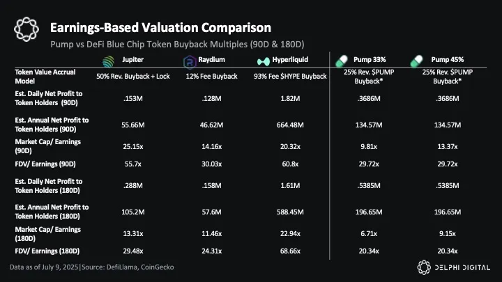 In contrast, using 180-day estimates, Pump, Raydium, and Jupiter would have much higher annualized and daily net profits flowing to token holders, directly correlated to their higher revenue during peak periods. This creates more reflexive buyback dynamics; when business conditions improve, token holder returns increase dramatically, but the inverse is also true during market downturns.