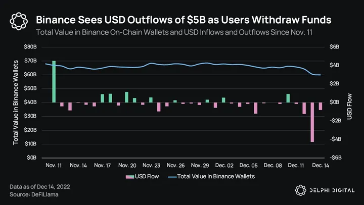 - Over the past two days, the total value in the on-chain wallets of Binance has decreased from $65B to $60B as the exchange saw more than $5B of USD outflows. This is the largest outflow since the exchange shared its addresses on Nov. 11, 2022.