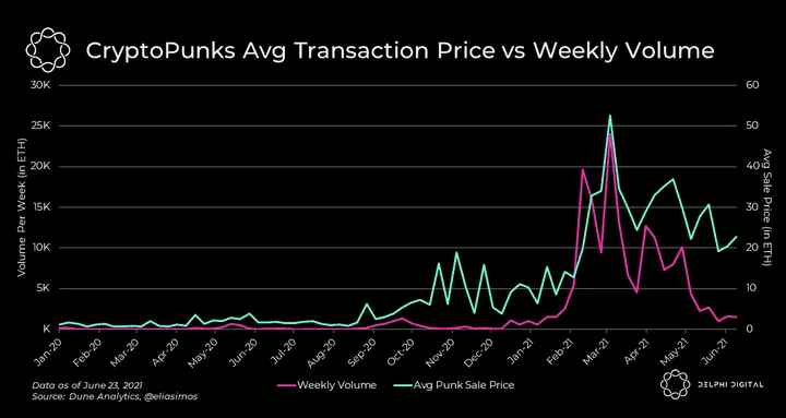- In other news, CryptoPunks have a seen a sharp decline in both prices and volume. From its peak earlier this year, the average transaction price for a Punk has reduced from over 50 ETH to just over 20 ETH now. Volume took a bigger hit, falling from approximately 25,000 ETH of weekly volume 1,500 ETH last week.
