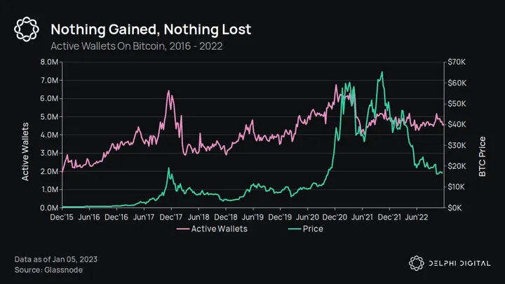Despite bearish BTC price action throughout 2022, activity on the Bitcoin network has remained stable. The number of active Bitcoin wallets was flat in 2022, at ~4.5M — inline with the numbers from the past four years. Looking at a four year cycle, the active wallet count is even trending upwards slightly.
