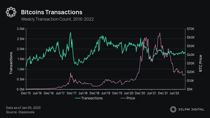 Transaction counts were relatively stable throughout 2022, but have declined overall since the peak of the 2021 bull market. Notably, Bitcoin’s transaction count has failed to surpass its peak from 2017. The lack of growth could be partly due to the influence of the hodl narrative — people buying Bitcoin, sending it to cold storage, and never spending it. The lack of growth could also be caused by Lightning taking up some of the demand. Or, more concerningly, the stagnant growth could be Bitcoin failing to maintain its relevance in a market that is constantly producing new technologies and narratives. Either way, the lack of transactional growth in Bitcoin between 2018 and 2023 is a cause for concern.