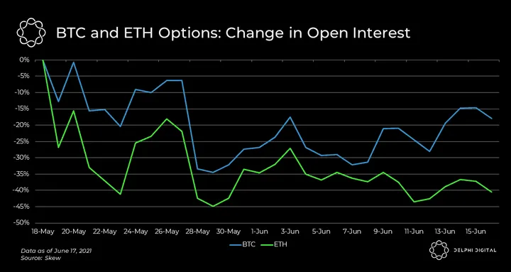 - Open interest for BTC and ETH options have been in decline since mid May. But, as noted yesterday, BTC options OI is starting to increase.