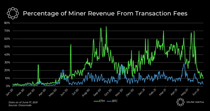 - The percentage of miner revenue contributed via transaction fees for Bitcoin and Ethereum have fallen sharply in the past month, as have active address and the daily transaction count.