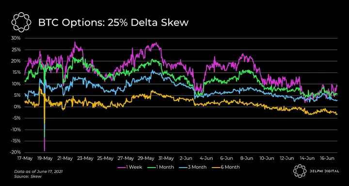 - Over the past month, the skew has been in decline, which means puts are getting expensive (due to higher demand) relative to calls.