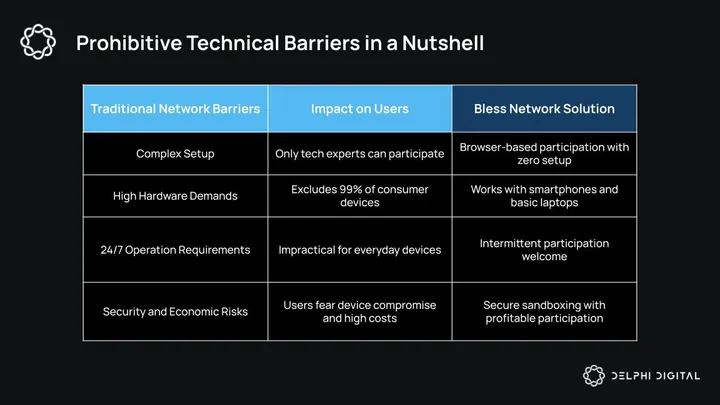 Before we explore Bless Network’s architecture in detail, it’s crucial to understand the real challenges facing traditional decentralized networks. Below are some fundamental design flaws that have prevented them from becoming viable alternatives to centralized infrastructure: