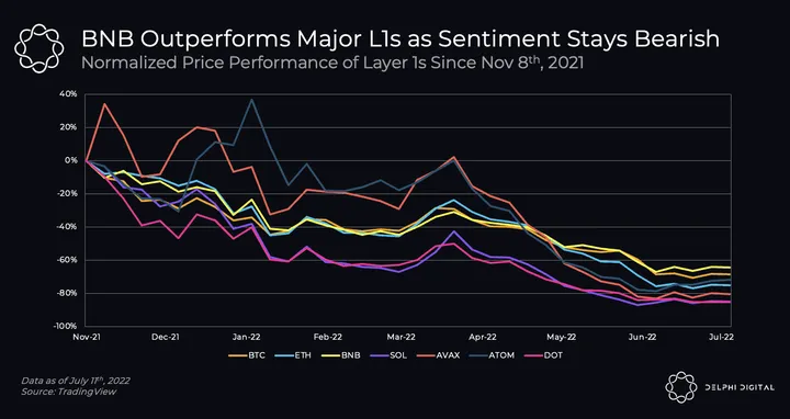 - Amidst the bloodshed, BNB has relatively outperformed BTC, ETH, and all other major layer-1 protocols. While BTC has experienced a 69% drawdown since all-time high in Nov-2021, BNB is down by 64%. In comparison, ETH, SOL, AVAX, ATOM, and DOT are down 72-85%, within the same time period.