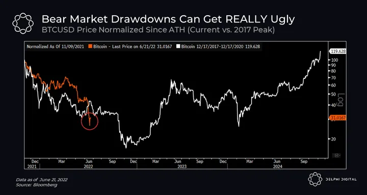- During the previous bear market, BTC eventually found its bottom after falling 85% from its 2017 high, whereas ETH experienced a 94% drop. This indicates that there may be further pain ahead during this cycle, even as past performance may not guarantee future results.