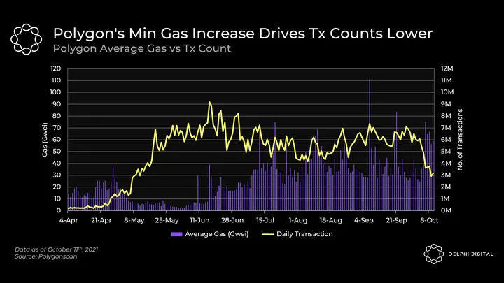 - That being said, the nodes that the Polygon team is operating have already been running these settings since 5 days ago. Average gas has spiked and is consistently above 50+ Gwei since then and the increased fees have likely caused daily tx count to fall substantially.