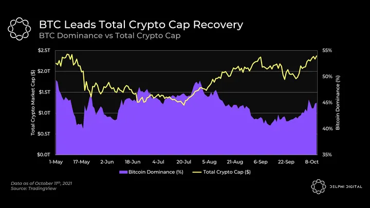 - Speculators that got caught up in the L1 + liquidity mining war were likely outperformed by BTC over the last week as BTC Dominance continues its rise and more capital rotates back in.
