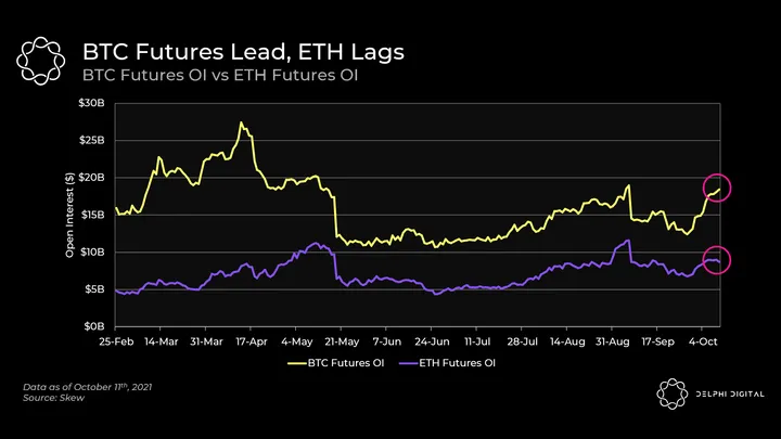 - To further reinforce BTC’s dominance in the current market, let us compare futures data for BTC and ETH. ETH and BTC OI have been mirroring each other from July until End of September. This changed in early October when a clear divergence between the two emerged (and is widening over the last 10 days).