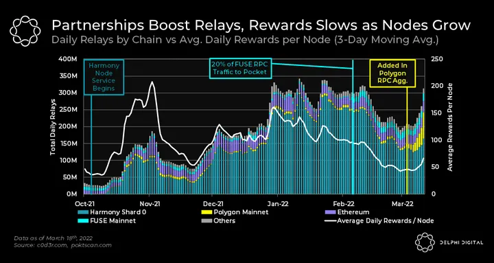 - As can be seen, the first catalyzer for Pocket was the integration of Harmony in October 2021. This caused daily relays on the network to grow by 6x from ~50M pre-Harmony to ~300M peak post-Harmony. This was followed by a positive, albeit a small impact powered by the Fuse integration in February. Finally, with the recent integration of Pocket Network into Polygon’s RPC aggregator, relays from Polygon soared. In just two weeks, following Polygon integration, the total daily relays grew by 44% allowing Pocket Network to achieve new highs at 408M relays on March 18th, 2022.
