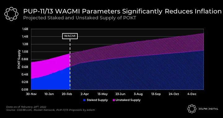 WAGMI (PUP-11/13) proposals which passed on February 24th drastically changed the revenue mechanism. An immediate effect of this change was a 15% reduction in POKT rewards per relay. We further analyze the impact of these proposals in the WAGMI section below.